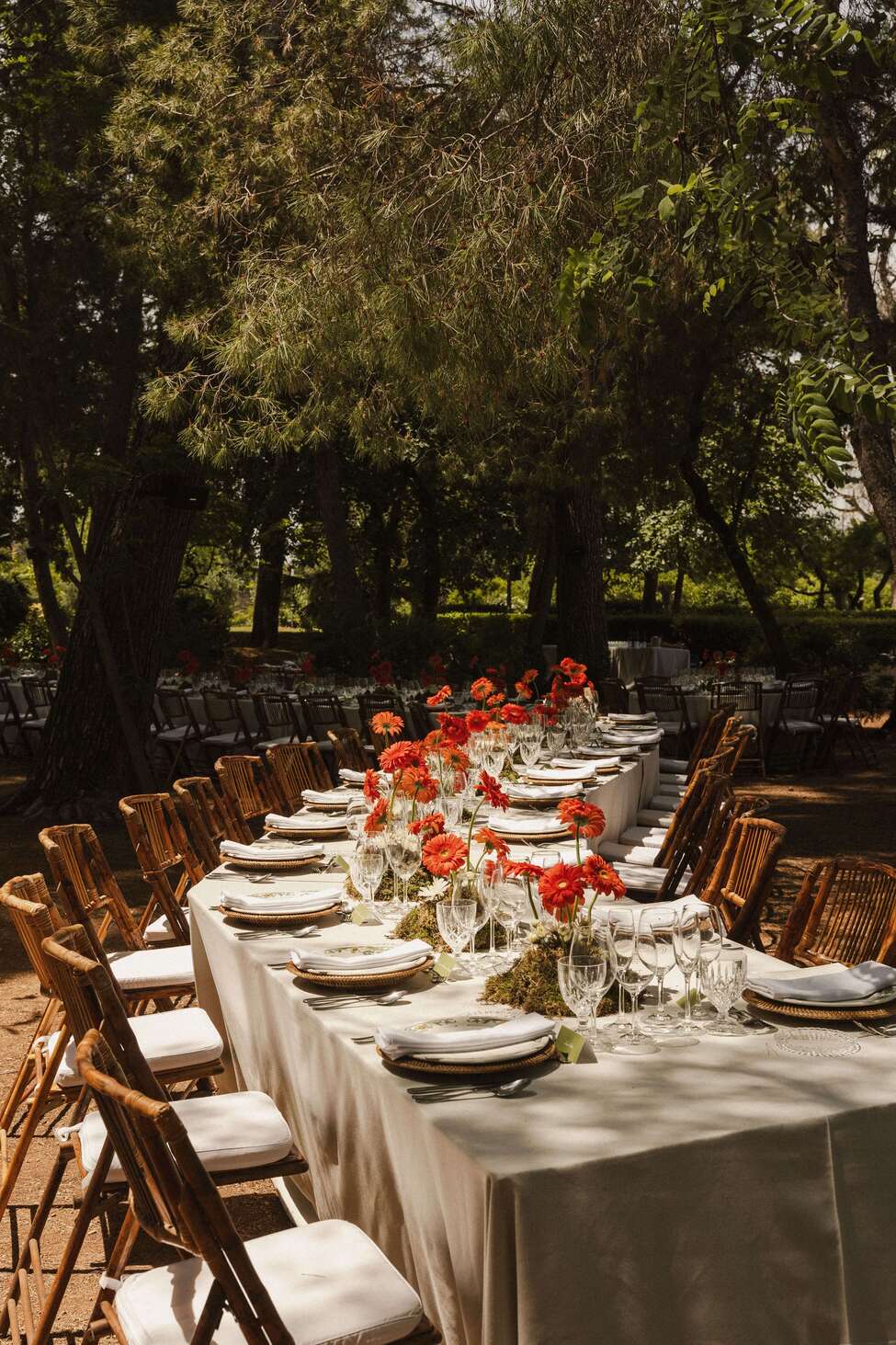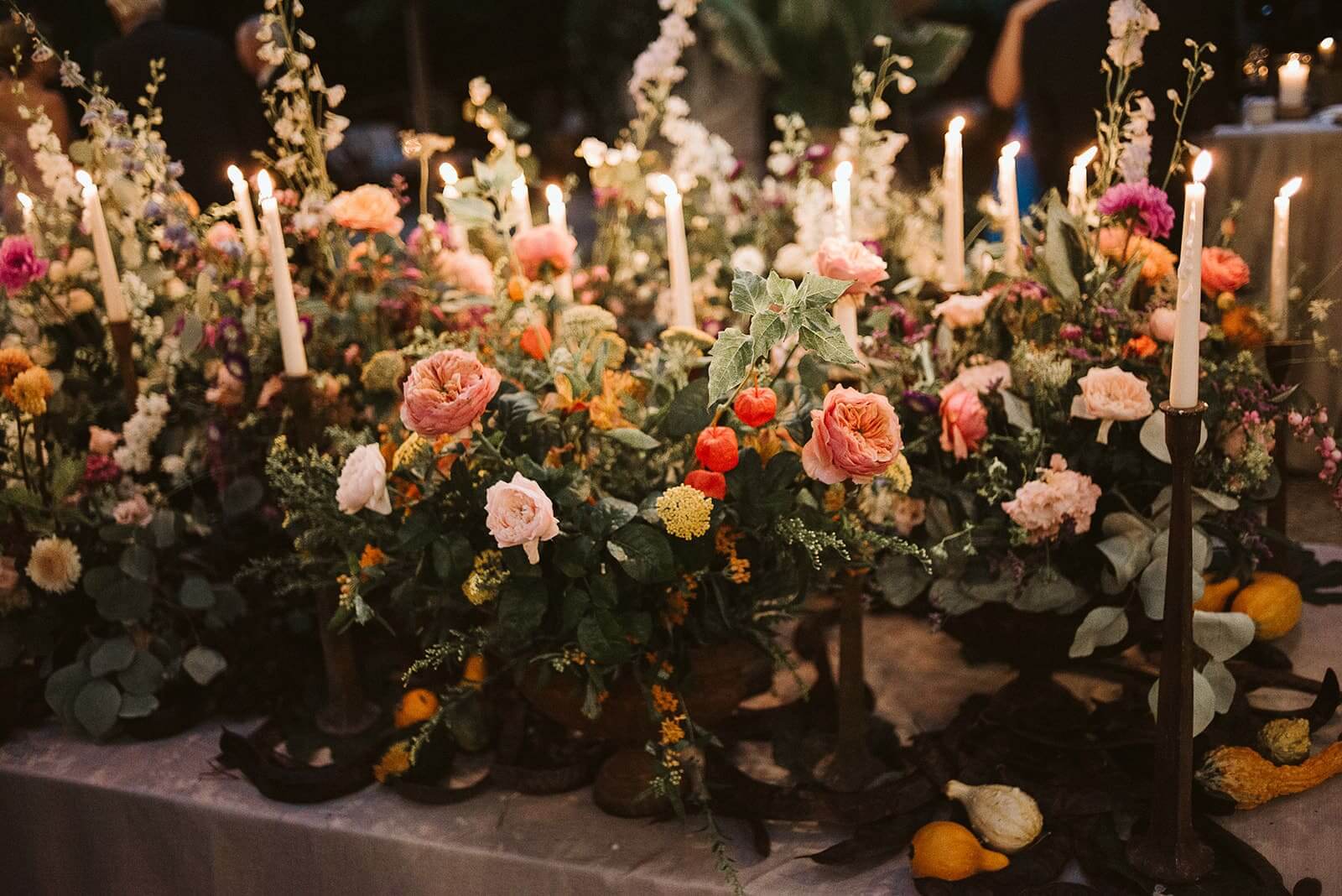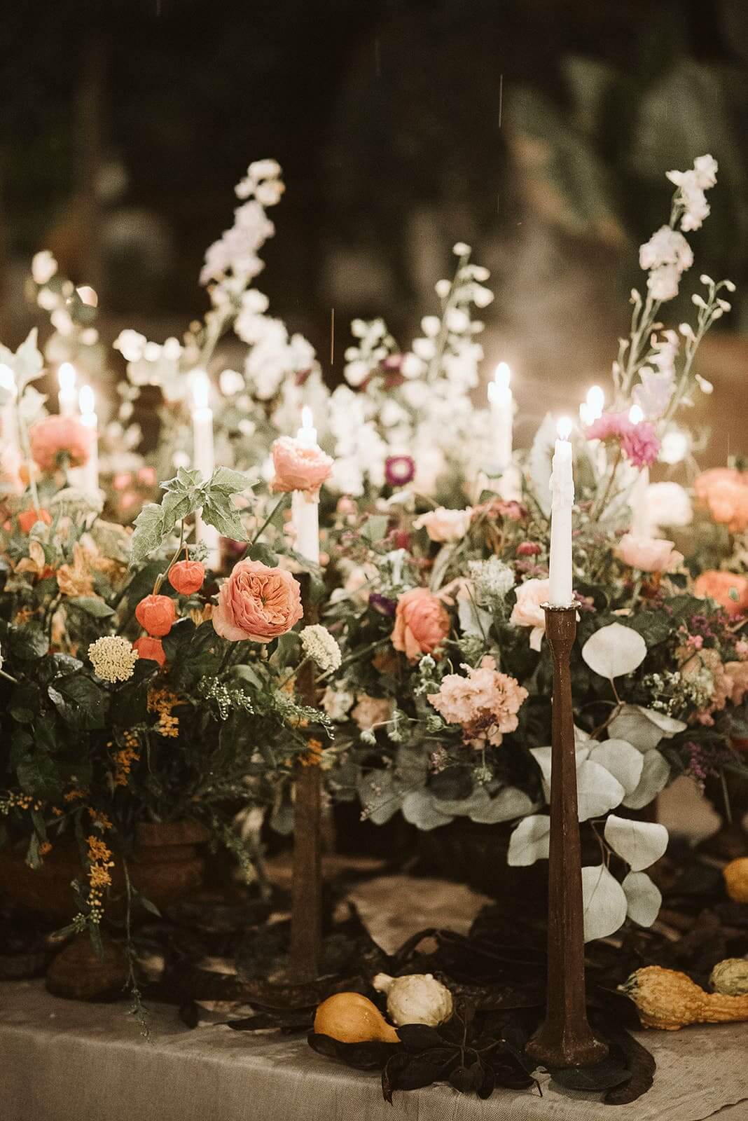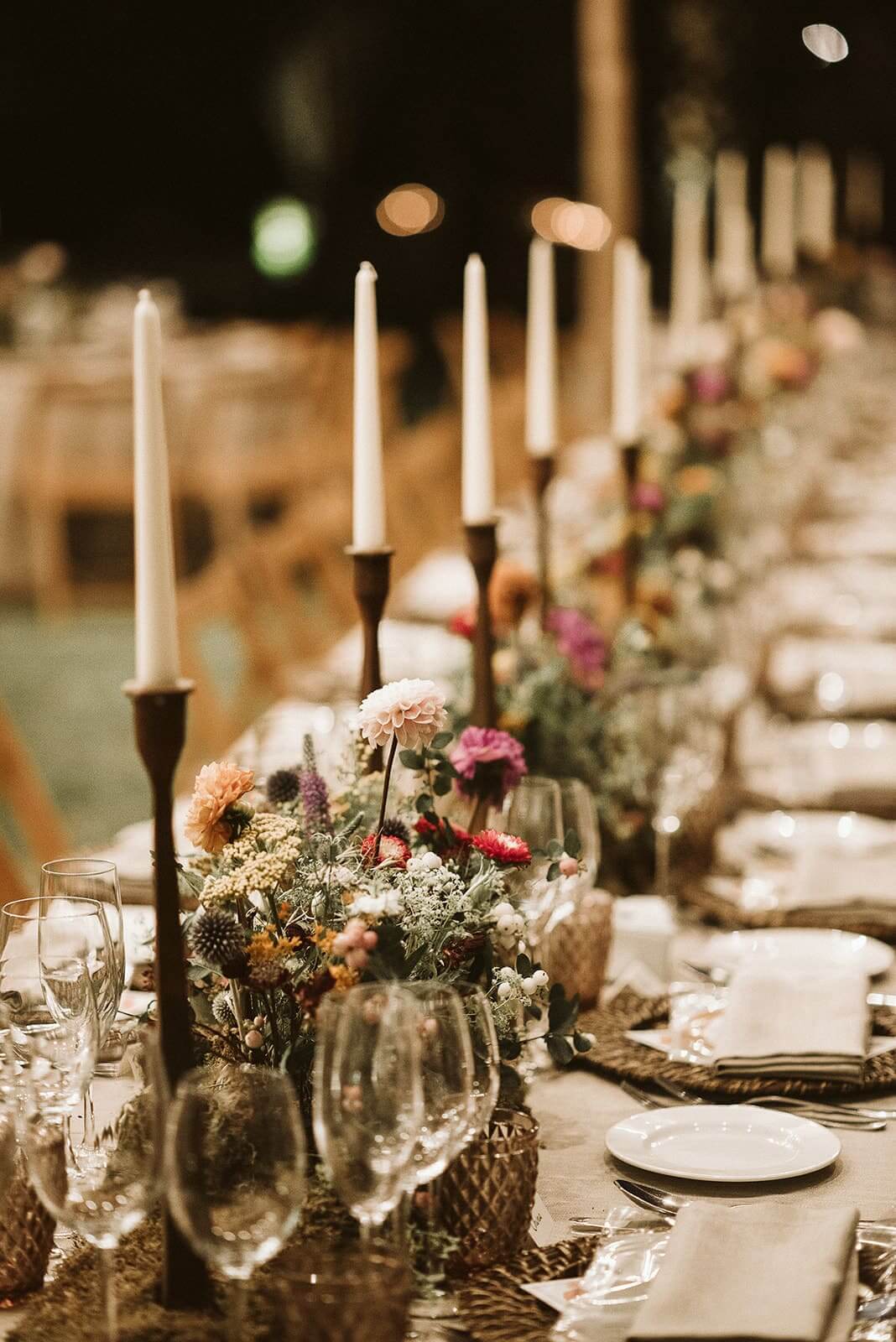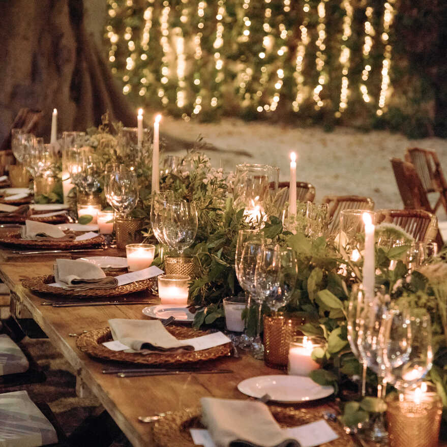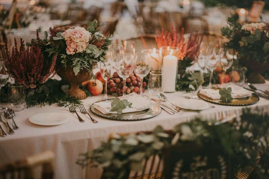 Para banquetes nocturnos, la tendencia en la zona son las mesas imperiales decoradas con caminos de musgo y velas largas. La iluminación es clave: combinar centros florales orgánicos con hileras de velas y fondos de luces de hadas crea una atmósfera mágica y muy acogedora.