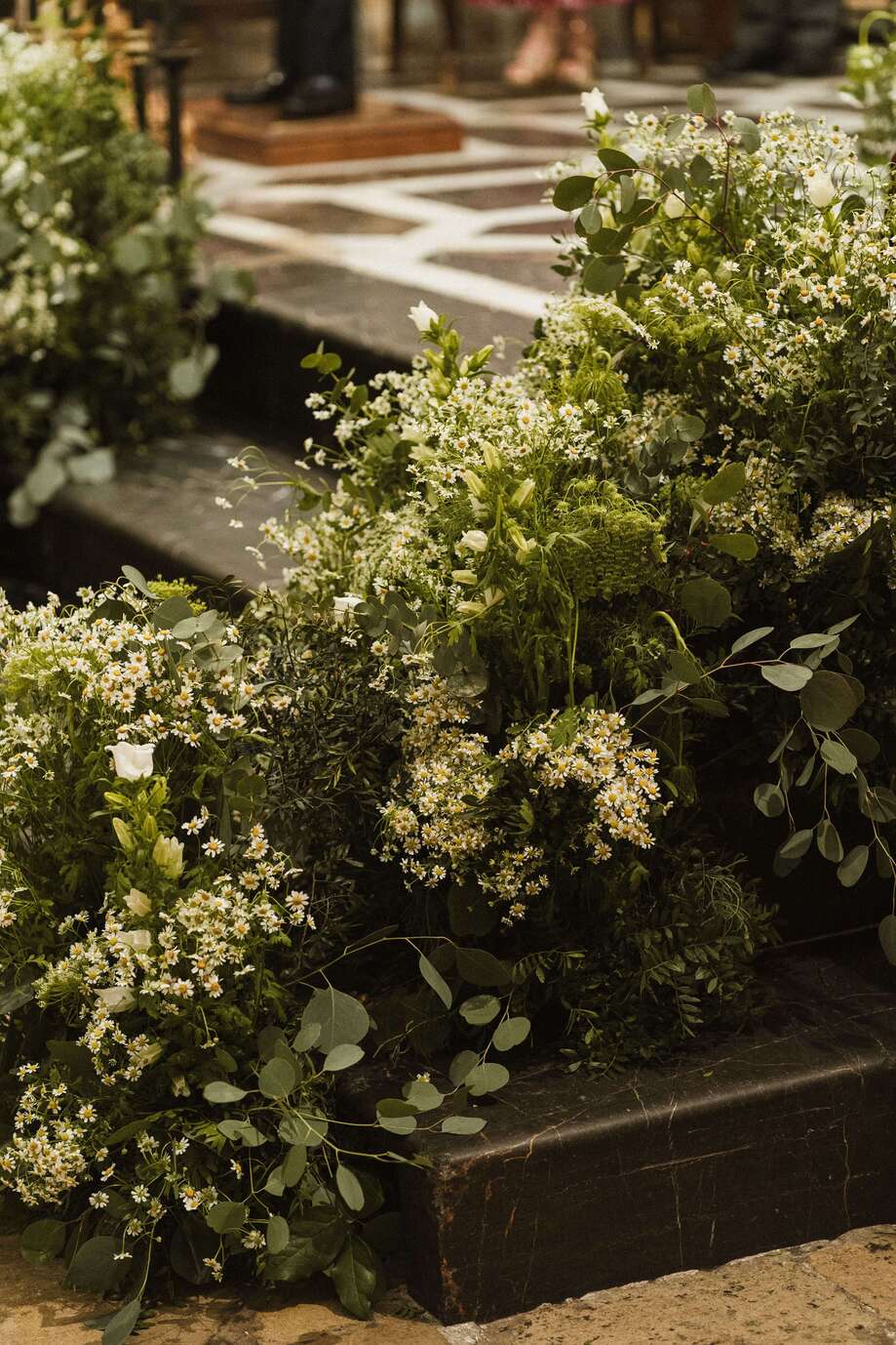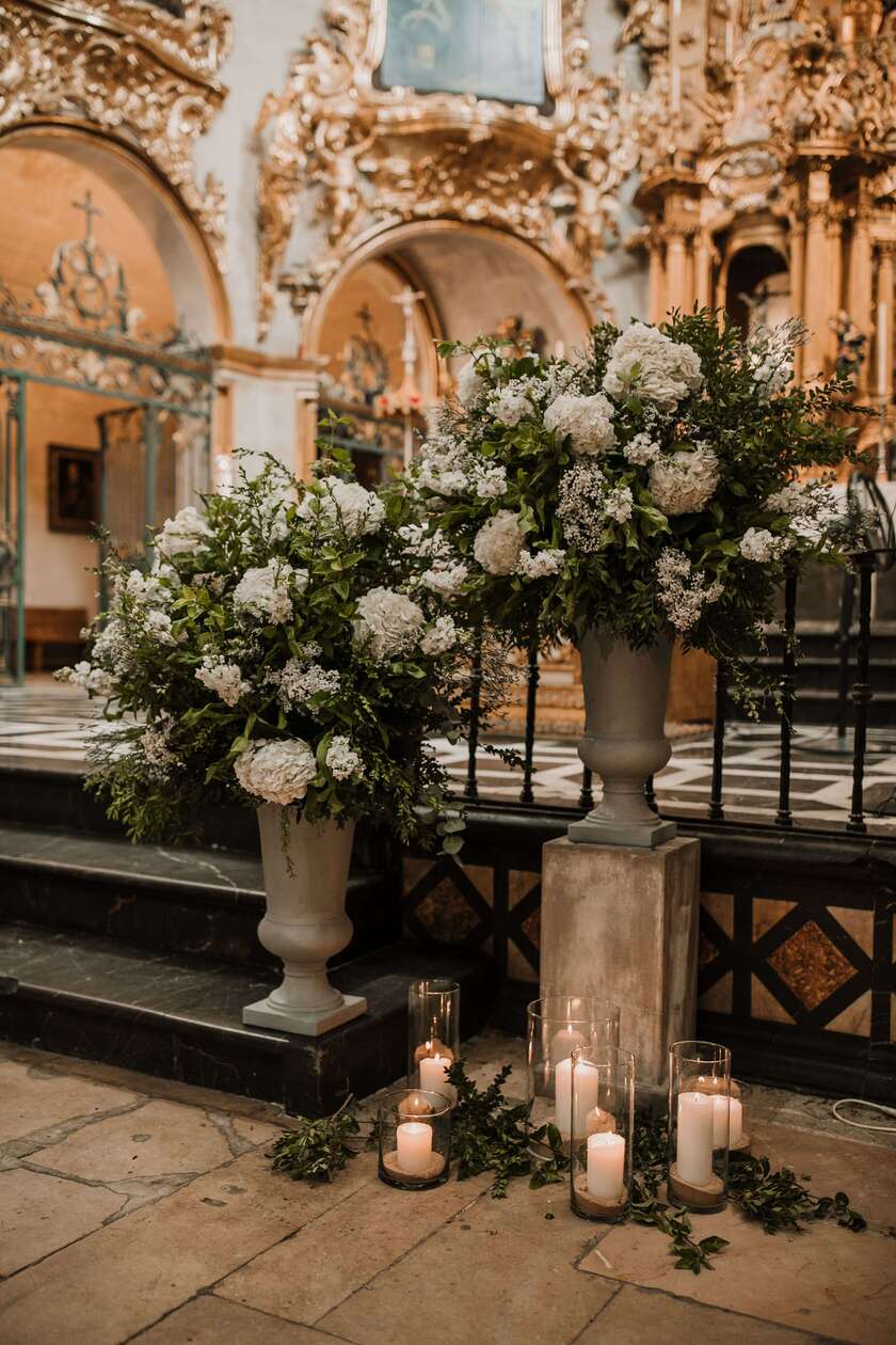 En Alicante contamos con templos de gran valor arquitectónico. Para no competir con la belleza del altar, recomendamos arreglos florales simétricos en copas de piedra o pedestales que enmarquen el espacio. Los pasillos flanqueados por flores silvestres bajas crean un efecto de «jardín interior» que moderniza el espacio sin perder la solemnidad.