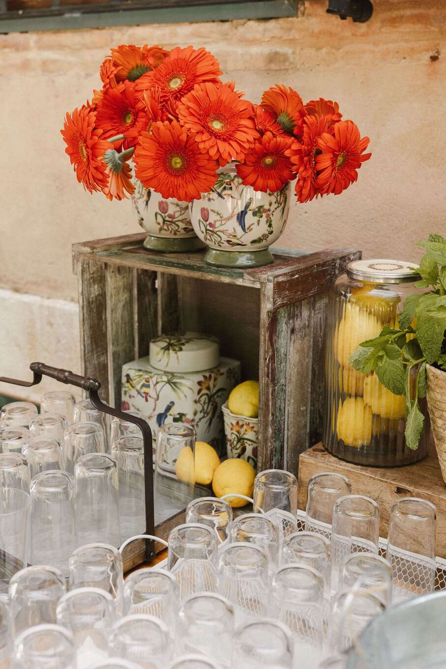 El estilo mediterráneo se basa en la naturalidad. Puedes conseguirlo utilizando cítricos (limones y naranjas) en los córners de bienvenida, musgo natural en los centros de mesa y una paleta de colores que evoque el mar y la tierra, como azules suaves, blancos puros y verdes intensos.