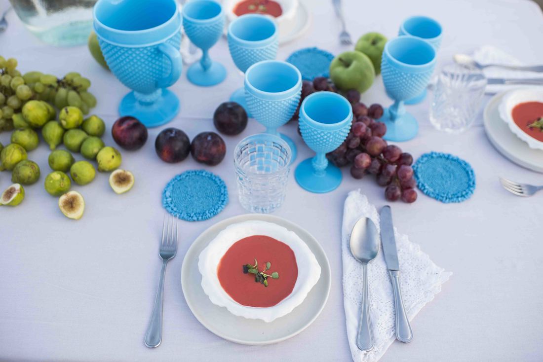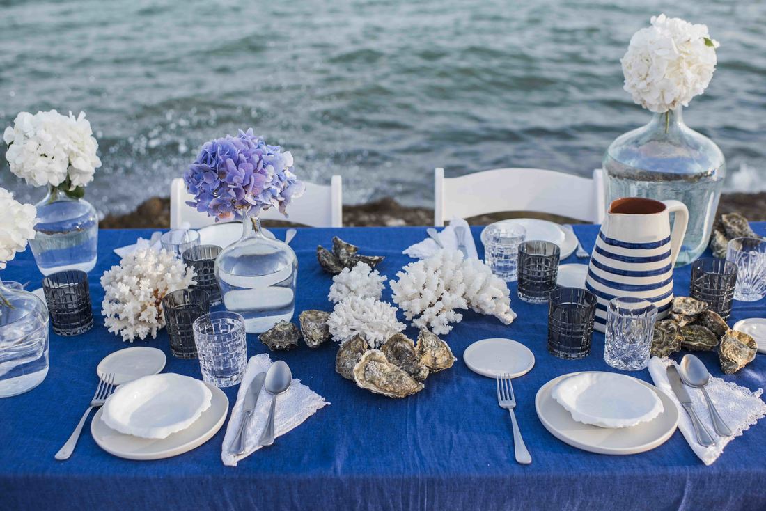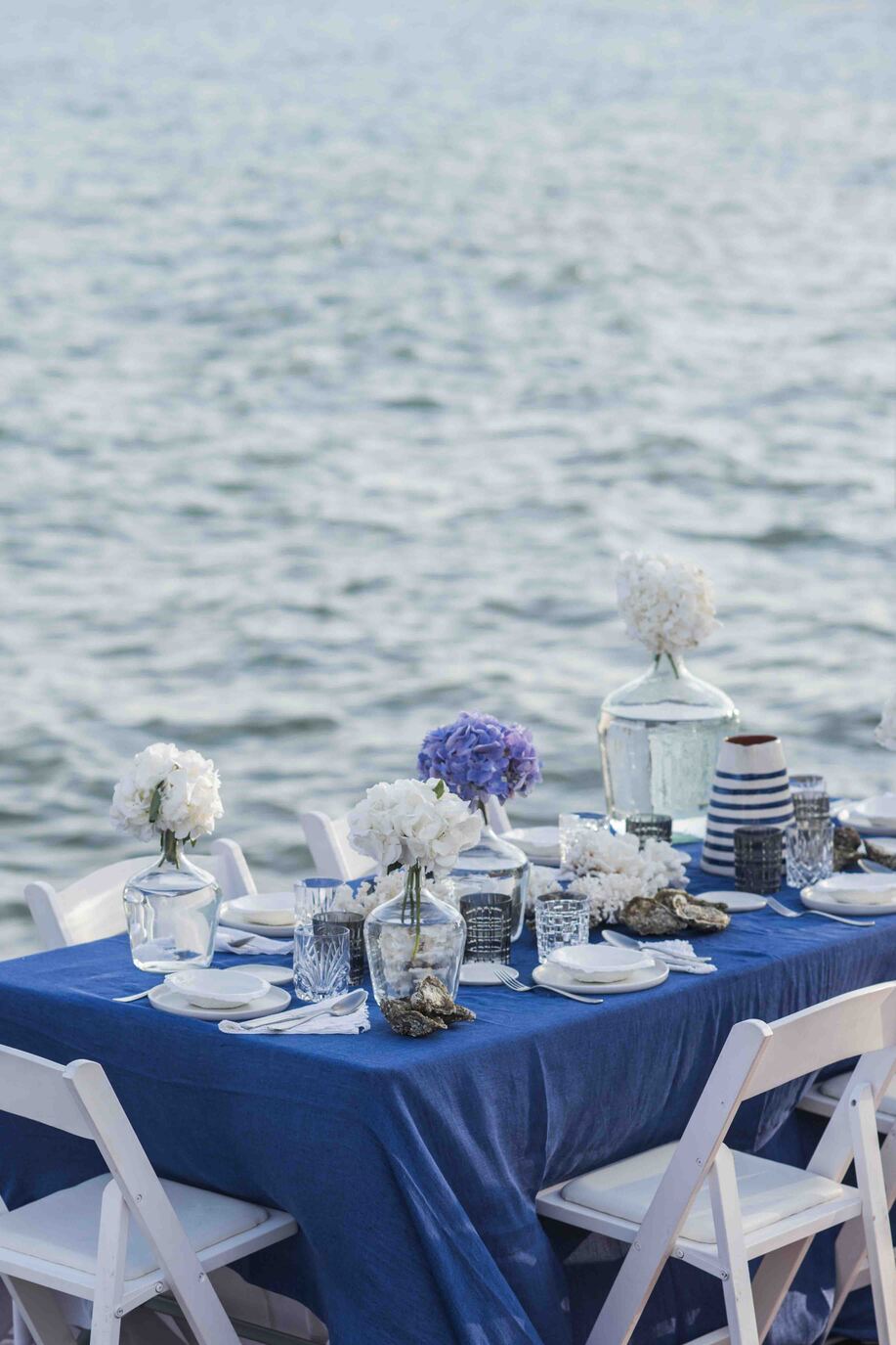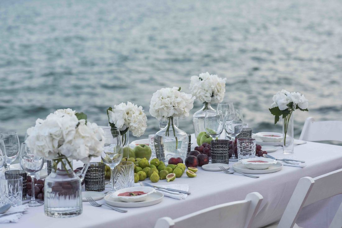 Absolutamente. El diseño floral no es un elemento aislado; es parte de la experiencia en la mesa (table setting). Coordinamos los tonos de las flores con el color de la mantelería y el estilo de la vajilla (por ejemplo, copas azules o platos de cerámica). Nos aseguramos de que la altura de los centros de mesa permita la conversación fluida entre los comensales.